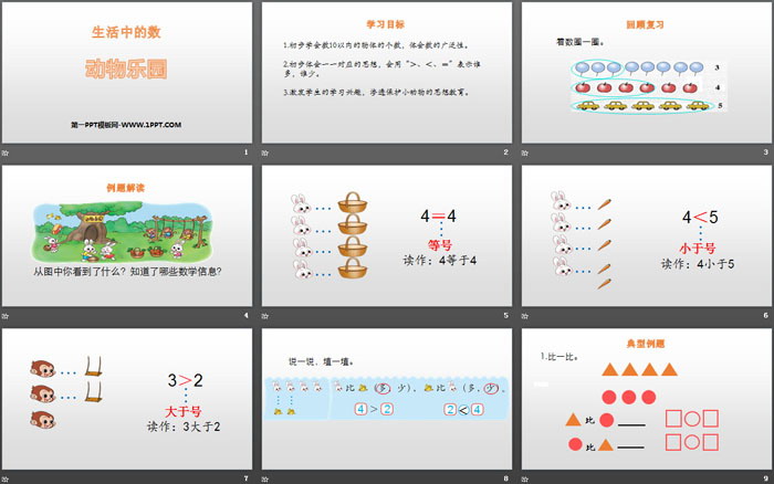 关键词:北师大版一年级上册数学PPT课件免费下载,动物乐园PPT下载,生活中的数PPT下载,.PPT格式;