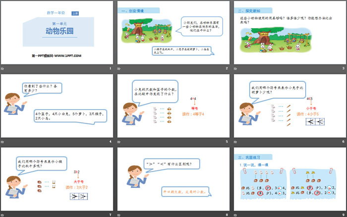 关键词:北师大版一年级上册数学PPT课件免费下载,动物乐园PPT下载,生活中的数PPT下载,.PPT格式;