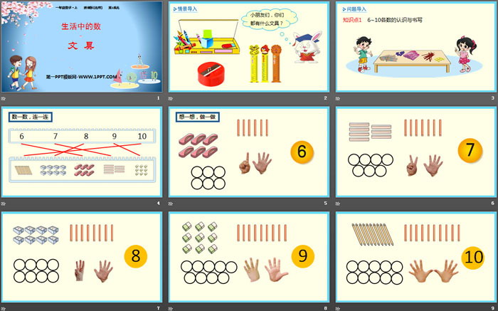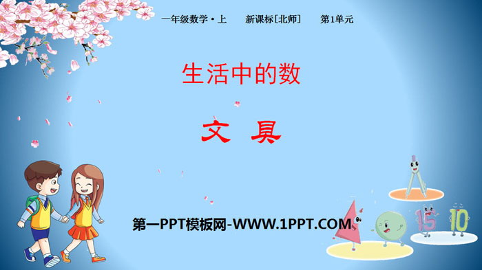 关键词:北师大版一年级上册数学PPT课件免费下载,文具PPT下载,生活中的数PPT下载,.PPT格式;