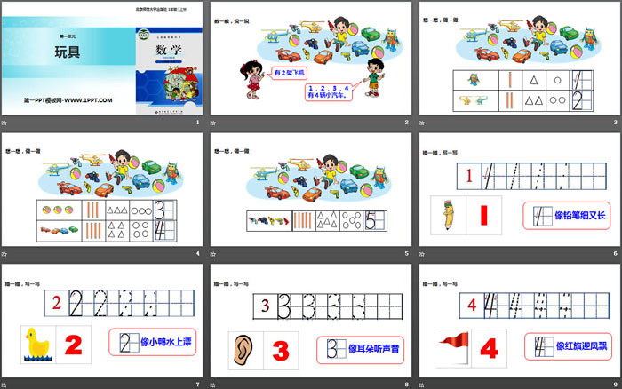 关键词:北师大版一年级上册数学PPT课件免费下载,玩具PPT下载,生活中的数学PPT下载,.PPT格式;