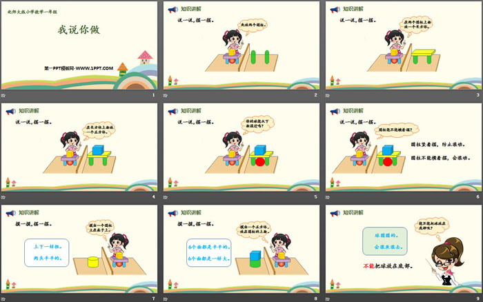 关键词:北师大版一年级上册数学PPT课件免费下载,我说你做PPT下载,认识图形PPT下载,.PPT格式;
