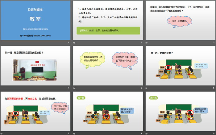 关键词:北师大版一年级上册数学PPT课件免费下载,教室PPT下载,位置与顺序PPT下载,.PPT格式;