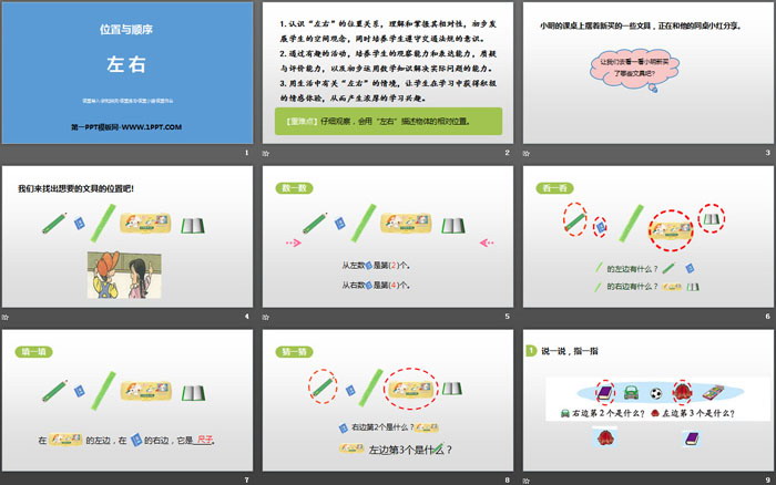 关键词:北师大版一年级上册数学PPT课件免费下载,左右PPT下载,位置与顺序PPT下载,.PPT格式;
