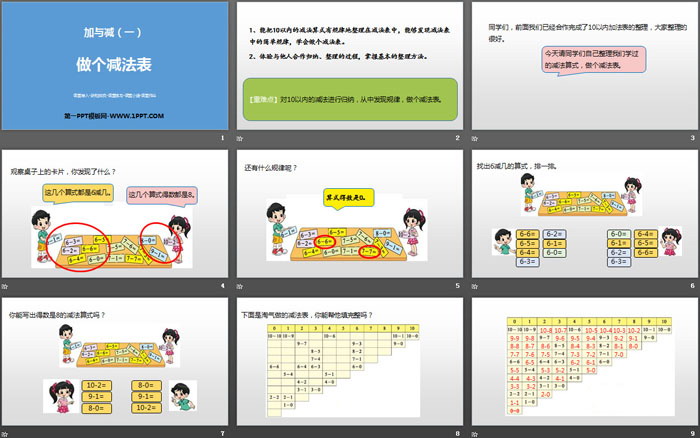 1、能把10以内的减法算式有规律地整理在减法表中,能够发现减法表中的简单规律,学会做个减法表。