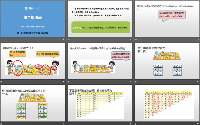 关键词:北师大版一年级上册数学PPT课件免费下载,做个加法表PPT下载,加与减PPT下载,.PPT格式;