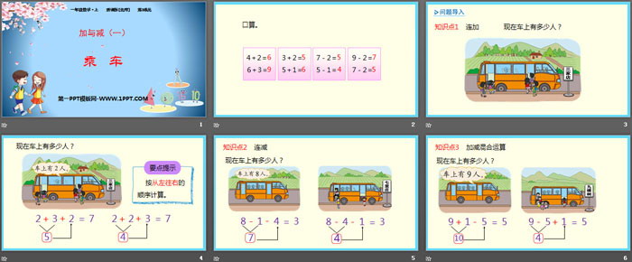 关键词:北师大版一年级上册数学PPT课件免费下载,乘车PPT下载,加与减PPT下载,.PPT格式;