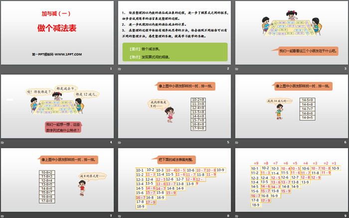 关键词:北师大版一年级下册数学PPT课件免费下载,做个减法表PPT下载,加与减PPT下载,.PPT格式;