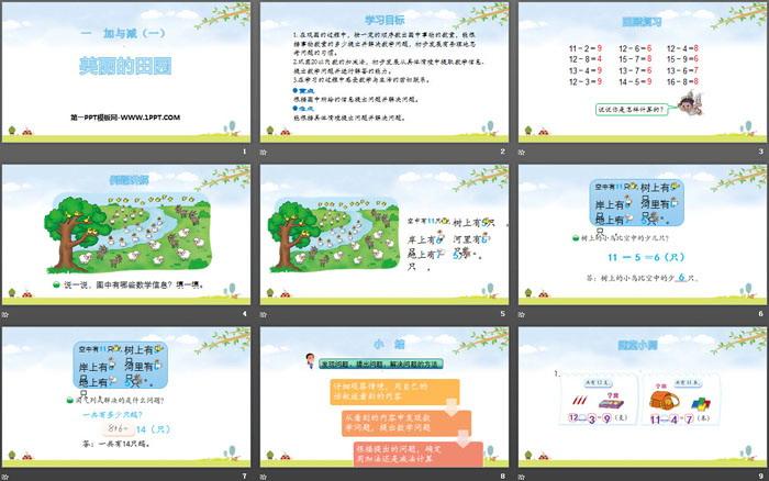 关键词:北师大版一年级下册数学PPT课件免费下载,美丽的田园PPT下载,加与减PPT下载,.PPT格式;
