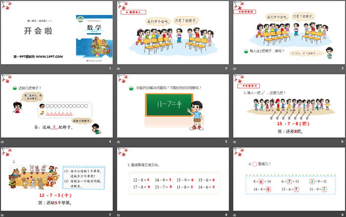 关键词:北师大版一年级下册数学PPT课件免费下载,开会啦PPT下载,加与减PPT下载,.PPT格式;