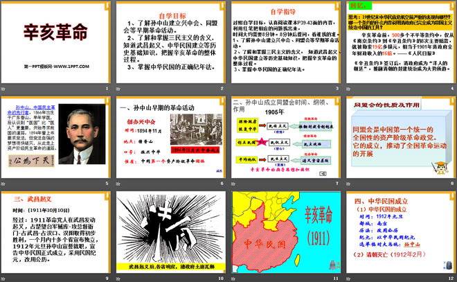 2、了解和掌握三民主义的含义, 知道武昌起义、中华民国建立等历史基础知识,把握辛亥革命的整体过程。