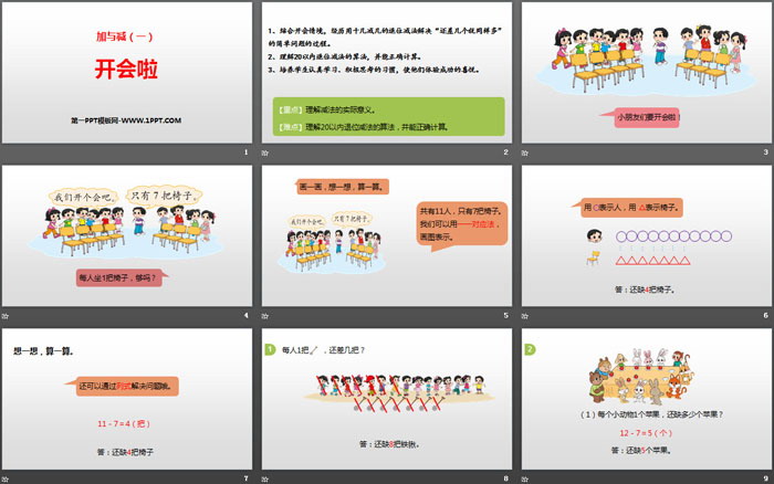 关键词:北师大版一年级下册数学PPT课件免费下载,开会啦PPT下载,加与减PPT下载,.PPT格式;