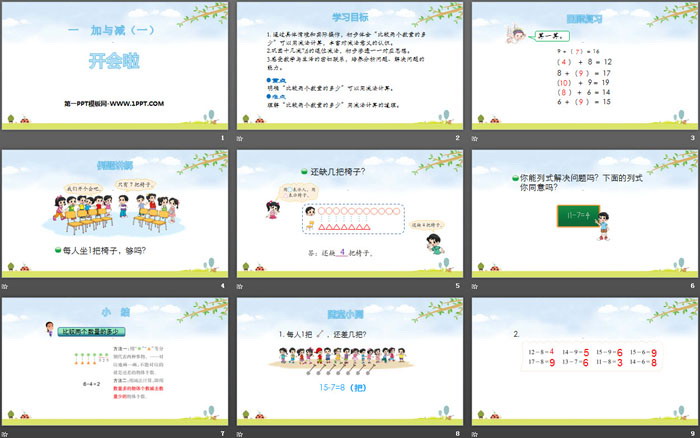 关键词:北师大版一年级下册数学PPT课件免费下载,开会啦PPT下载,加与减PPT下载,.PPT格式;