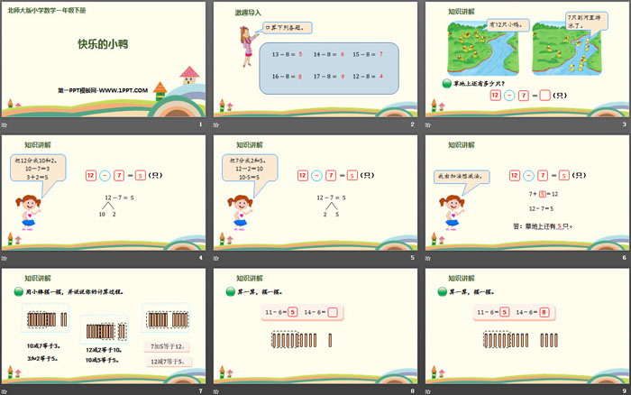 关键词:北师大版一年级下册数学PPT课件免费下载,快乐的小鸭PPT下载,加与减PPT下载,.PPT格式;