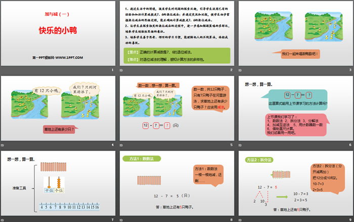 关键词:北师大版一年级下册数学PPT课件免费下载,快乐的小鸭PPT下载,加与减PPT下载,.PPT格式;