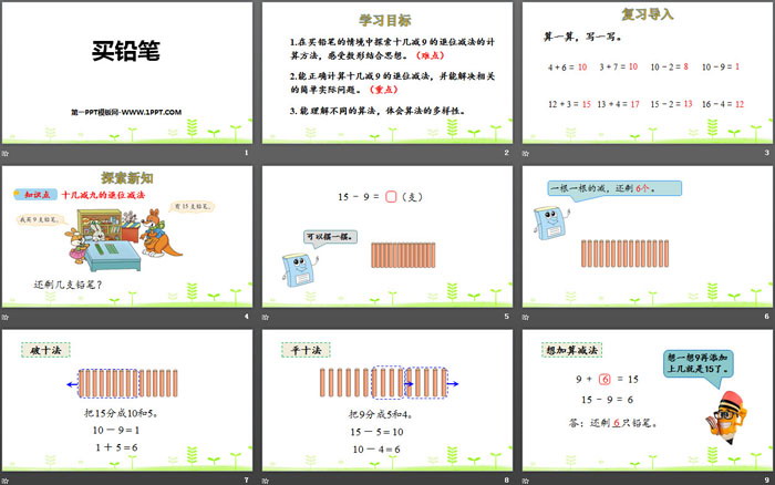 1.在买铅笔的情境中探索十几减 9 的退位减法的计算方法,感受数形结合思想。(难点)