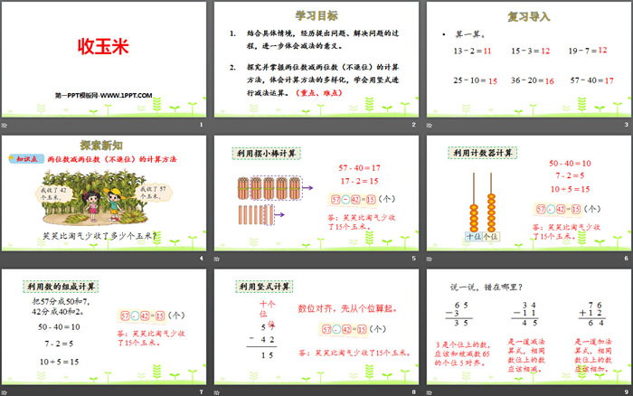 关键词:北师大版一年级下册数学PPT课件免费下载,收玉米PPT下载,加与减PPT下载,.PPT格式;