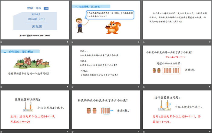 关键词:北师大版一年级下册数学PPT课件免费下载,采松果PPT下载,加与减PPT下载,.PPT格式;