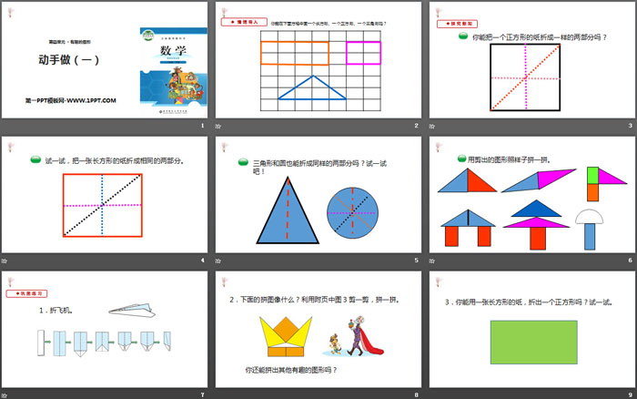 关键词:北师大版一年级下册数学PPT课件免费下载,动手做PPT下载,有趣的图形PPT下载,.PPT格式;