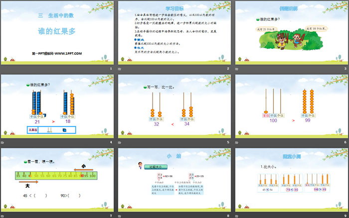 关键词:北师大版一年级下册数学PPT课件免费下载,谁的红果多PPT下载,生活中的数PPT下载,.PPT格式;