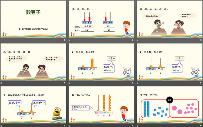 关键词:北师大版一年级下册数学PPT课件免费下载,数豆子PPT下载,生活中的数PPT下载,.PPT格式;