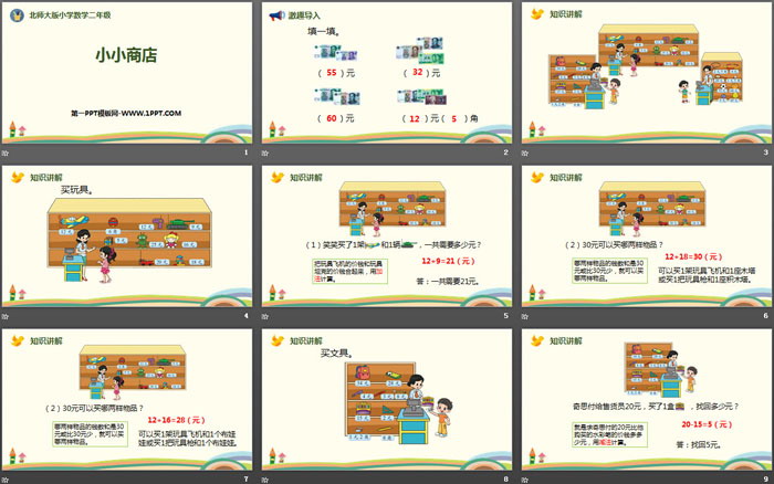 关键词:北师大版二年级上册数学PPT课件免费下载,小小商店PPT下载,购物PPT下载,.PPT格式;