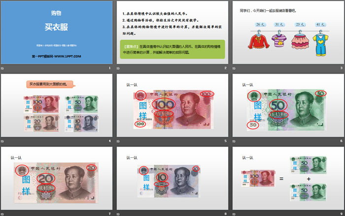 关键词:北师大版二年级上册数学PPT课件免费下载,买衣服PPT下载,购物PPT下载,.PPT格式;