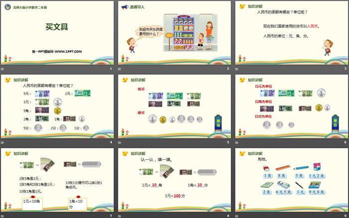关键词:北师大版二年级上册数学PPT课件免费下载,买文具PPT下载,购物PPT下载,.PPT格式;