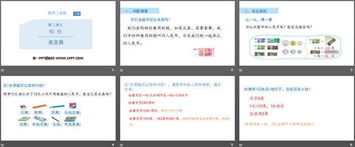 关键词:北师大版二年级上册数学PPT课件免费下载,买文具PPT下载,购物PPT下载,.PPT格式;