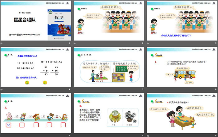 关键词:北师大版二年级上册数学PPT课件免费下载,星星合唱队PPT下载,加与减PPT下载,.PPT格式;
