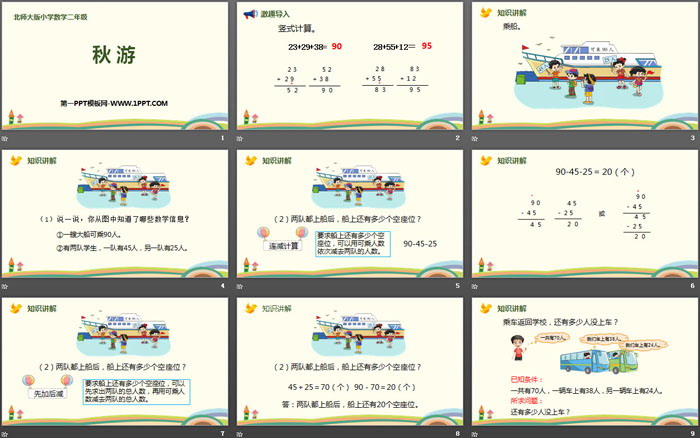 关键词:北师大版二年级上册数学PPT课件免费下载,秋游PPT下载,加与减PPT下载,.PPT格式;
