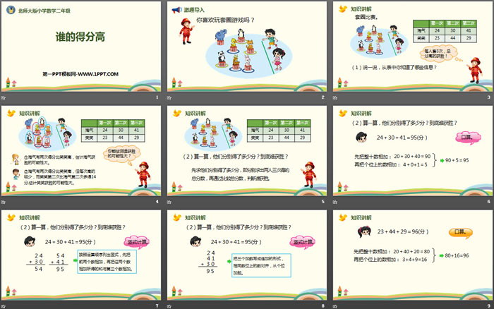 关键词:北师大版二年级上册数学PPT课件免费下载,谁的得分高PPT下载,加与减PPT下载,.PPT格式;
