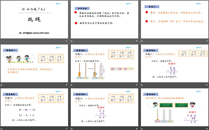 关键词:北师大版一年级下册数学PPT课件免费下载,跳绳PPT下载,加与减PPT下载,.PPT格式;