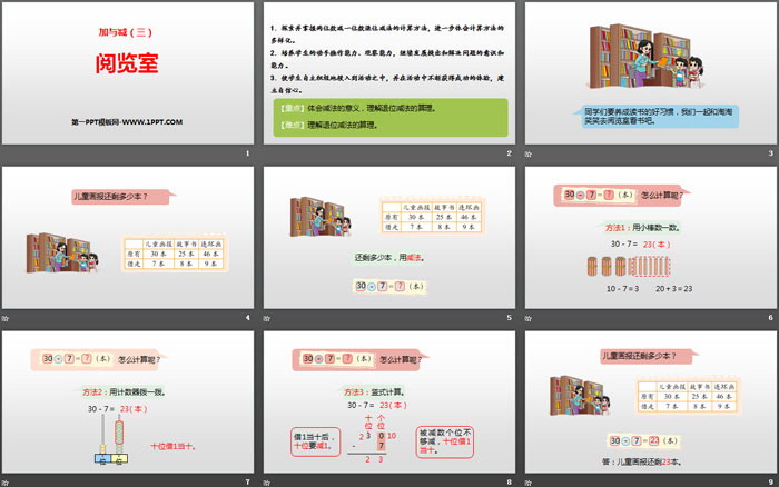 关键词:北师大版一年级下册数学PPT课件免费下载,阅览室PPT下载,加与减PPT下载,.PPT格式;