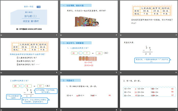 关键词:北师大版一年级下册数学PPT课件免费下载,阅览室PPT下载,加与减PPT下载,.PPT格式;