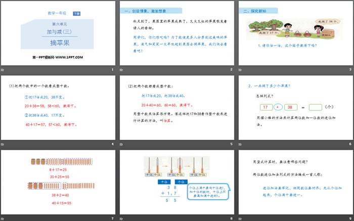关键词:北师大版一年级下册数学PPT课件免费下载,摘苹果PPT下载,加与减PPT下载,.PPT格式;