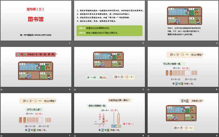 关键词:北师大版一年级下册数学PPT课件免费下载,图书馆PPT下载,加与减PPT下载,.PPT格式;