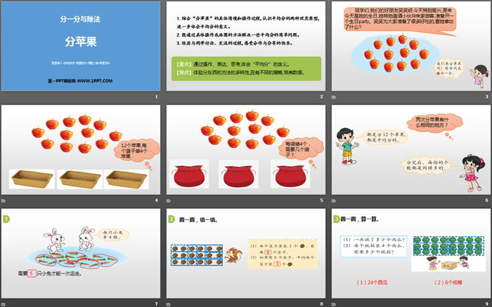关键词:北师大版二年级上册数学PPT课件免费下载,分苹果PPT下载,分一分与除法PPT下载,.PPT格式;