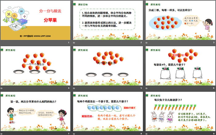 关键词:北师大版二年级上册数学PPT课件免费下载,分苹果PPT下载,分一分与除法PPT下载,.PPT格式;
