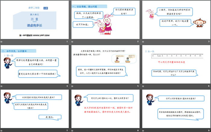 关键词:北师大版二年级上册数学PPT课件免费下载,课桌有多长PPT下载,测量PPT下载,.PPT格式;