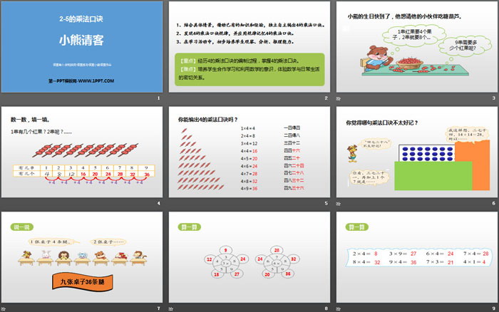 关键词:北师大版二年级上册数学PPT课件免费下载,小熊请客PPT下载,2~5的乘法口诀PPT下载,.PPT格式;