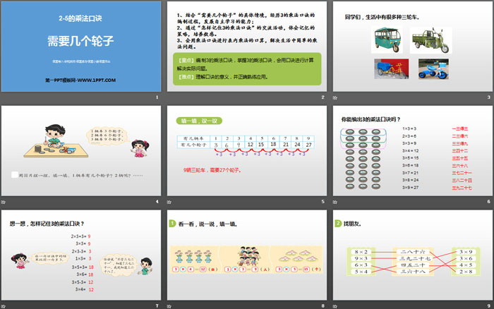 1、结合“需要几个轮子”的具体情境,经历3的乘法口诀的编制过程,发展自主学习的能力;