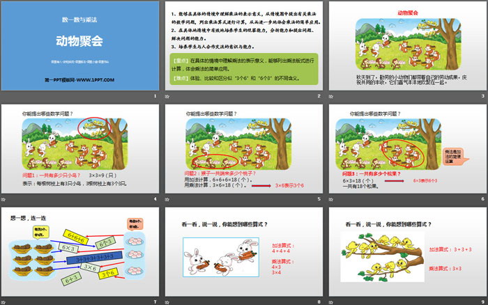 关键词:北师大版二年级上册数学PPT课件免费下载,动物聚会PPT下载,数一数与乘法PPT下载,.PPT格式;