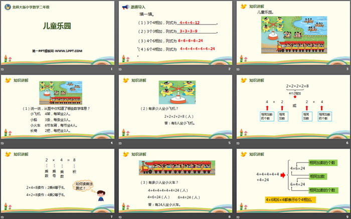 关键词:北师大版二年级上册数学PPT课件免费下载,儿童乐园PPT下载,数一数与乘法PPT下载,.PPT格式;