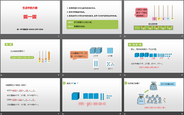 关键词:北师大版二年级下册数学PPT课件免费下载,拨一拨PPT下载,生活中的大数PPT下载,.PPT格式;