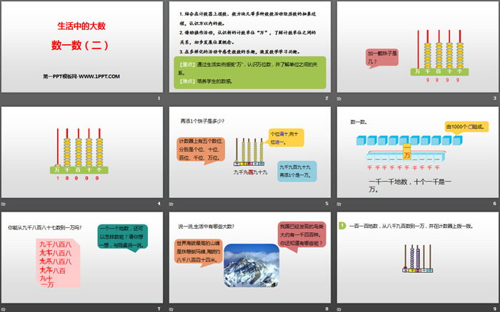 关键词:北师大版二年级下册数学PPT课件免费下载,数一数PPT下载,生活中的大数PPT下载,.PPT格式;