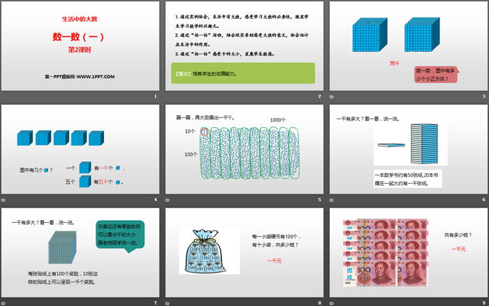 关键词:北师大版二年级下册数学PPT课件免费下载,数一数PPT下载,生活中的大数PPT下载,.PPT格式;