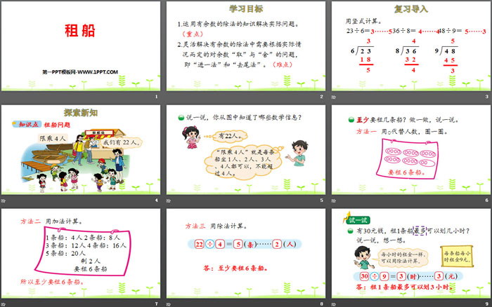关键词:北师大版二年级下册数学PPT课件免费下载,租船PPT下载,除法PPT下载,.PPT格式;