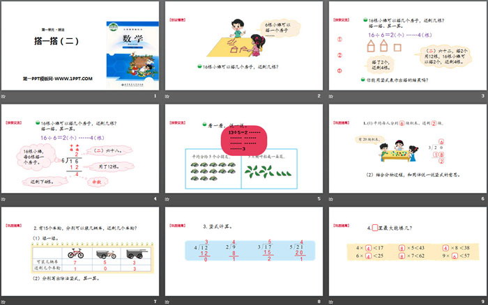 关键词:北师大版二年级下册数学PPT课件免费下载,搭一搭PPT下载,除法PPT下载,.PPT格式;