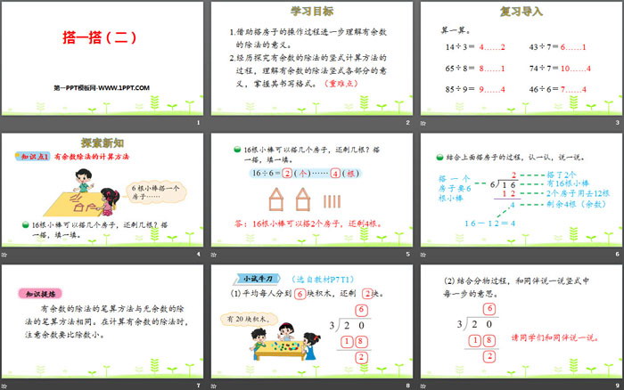 1.借助搭房子的操作过程进一步理解有余数的除法的意义。