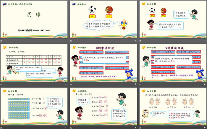 关键词:北师大版二年级上册数学PPT课件免费下载,买球PPT下载,6~9的乘法口诀PPT下载,.PPT格式;